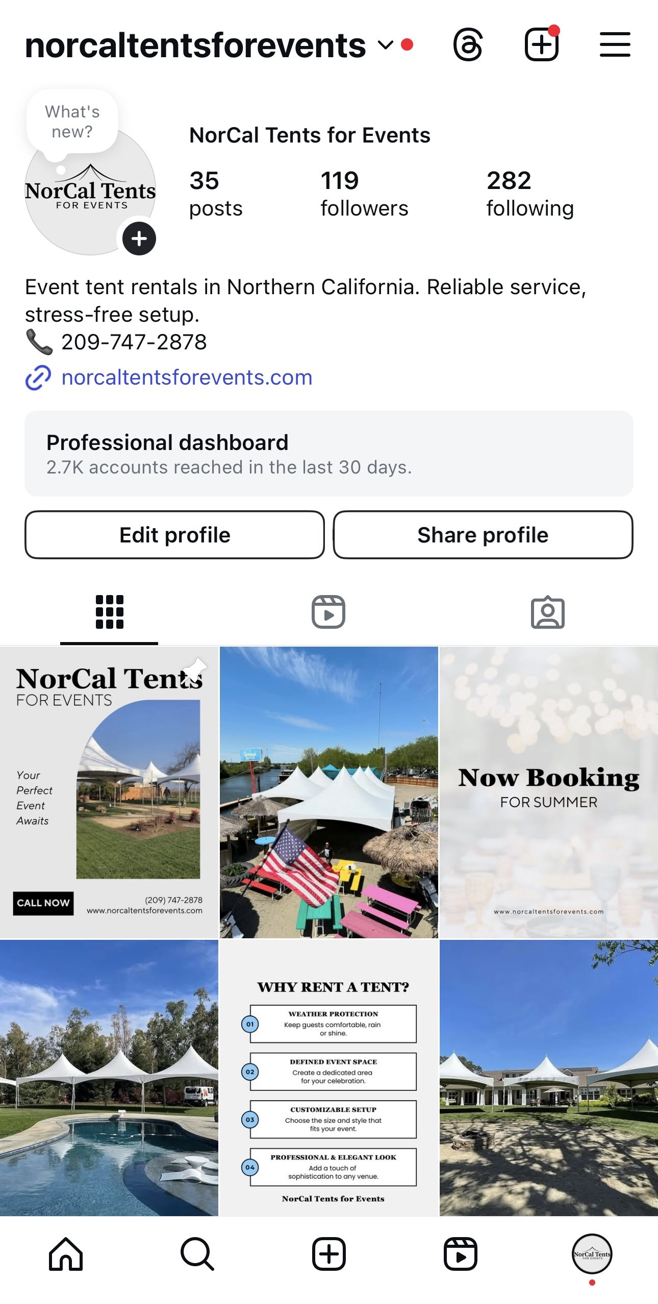 I partnered with a small tent rental company in Northern California to help build their digital presence from the ground up. With no access to branding assets or digital tools, I created a custom website, launched a Google Ads campaign, redesigned their Instagram account, and developed brand visuals to increase visibility and engagement.